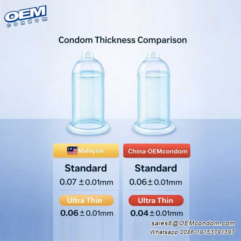 Standard Condom Thickness Ultra Thin Condom Thickess Malaysia 0.07±0.01mm 0.06±0.01mm China-OEMcondom 0.06±0.01mm 0.04±0.01mm Condom thickness plays an important role in comfort, sensitivity, and user experience. Malaysia condom factories typically produce standard condoms with a thickness of 0.07 ± 0.01 mm, while their ultra-thin versions measure 0.06 ± 0.01 mm, offering a balance between durability and comfort. In comparison, China OEMcondom …